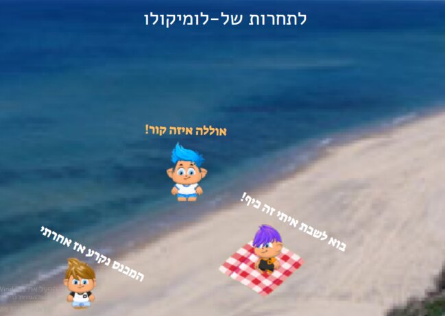 לסיפור יאלה בוא שלושה חברים היה להם חופש היה אחד שקראו לו נהוראי הוא לא יכול לשמור על כל הדברים ונקרע לו המכנסיים השני מפחד ממים♂️ השלישי יודע לשחות טוב ואחר כך אמר קר לי ממש!