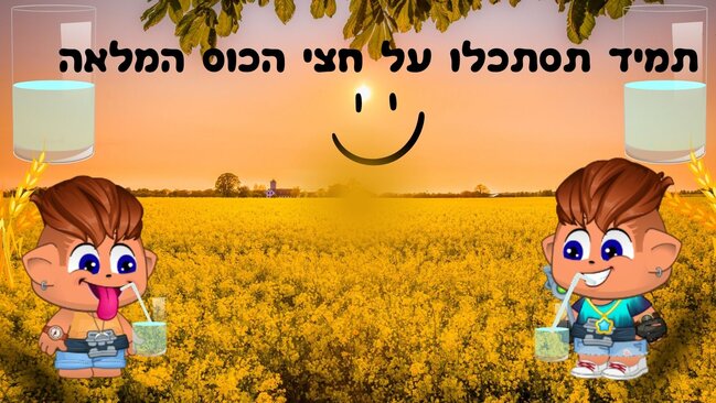 היי כולם! היום החלטתי להתמקד על משפט שאני כנראה חי עליו: "תמיד תסתכלו על חצי הכוס המלאה" אולי חלקכם לא יבינו למה אני מתמקד עליו עכשיו. אז אני אסביר, כל פעם מחדש, המשפט הזה מעיר אותי. בכל מכשול מראה לי את הצד החיובי! ____________________________________ עכשיו אני אראה לכם דוגמאות, אחת מהדימיון, והשנייה מהמציאות