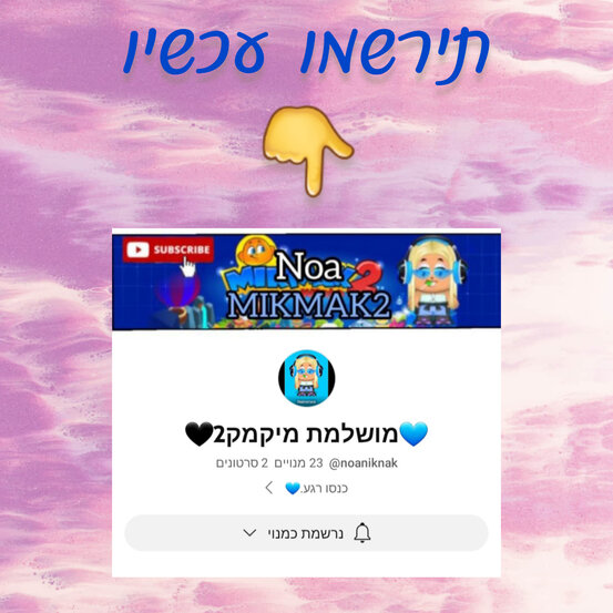 היי מיקמקים, מה נשמע? לפני כמה ימים חברה שלי פתחה ערוץ (קוראים במיקמק מושלמת7565) ונשמח שתירשמו אליו!!! כמובן שאל תשקחו להרשם גם לערוץ שלי אוריה מהמיק! וההה ביום ראשון יעלה סרטון מפגש בשני הערוצים נשמח שתגיעו!! אולי גם כפיר יבוא? מחכים לתשובה ממנו! נתראה ביצירה הבאה ביי