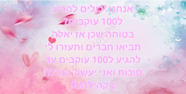 בהצלחה במשימה!! תקשיבי לי, הדבר הכי מספק בקהילה זה להגיע ל-100 עוקבים!! אני התרגשתי בטירוף!! אז מקווה שעזרתי לך, לפחות קצת❤ |