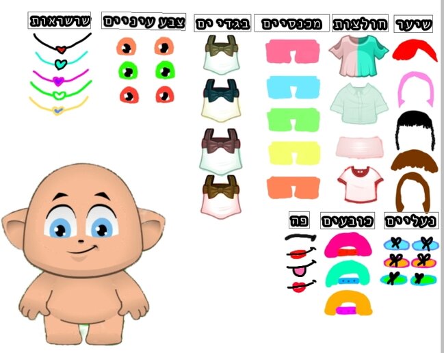 שיער 5 חולצה4 מכנס 1 בגד ים 1 עניים 1 שרשרת 2 נעליים 1 כובע 2 פה 3 |