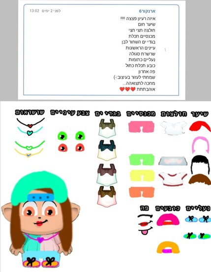 מאוד הנה לבוש אשמח שתעשי שיער חום ארוך חולצה עם לבבות מכנס כתום נעלים תכלת פה לשון כובע ורוד עניינים ורוד לא בטוחה מה צבע שלהם חחח שרשרת שחור אדום וזהו❣️ |