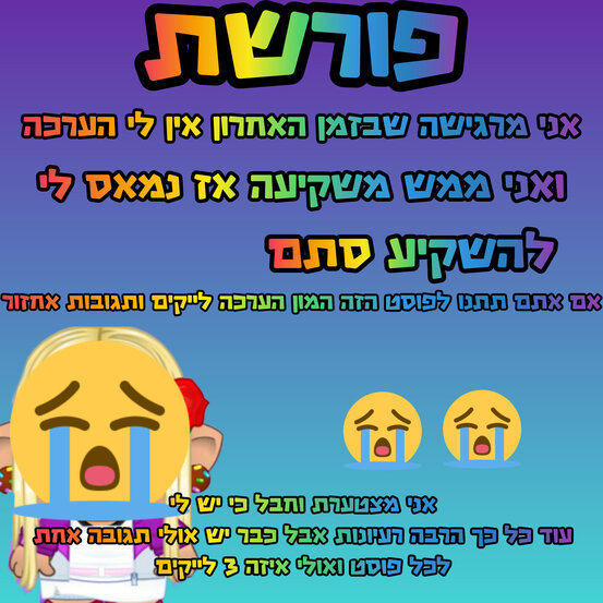 לאאאאא לא לא אלא אל לאאא!! אל תפרשי!!!!!.... הקהילה שלך מושלמת כ"כ כ"כ כ"כ כ"כ כ"כ... באמת תפרגנו לההה אוהבתתת ❤️❤️❤️ |