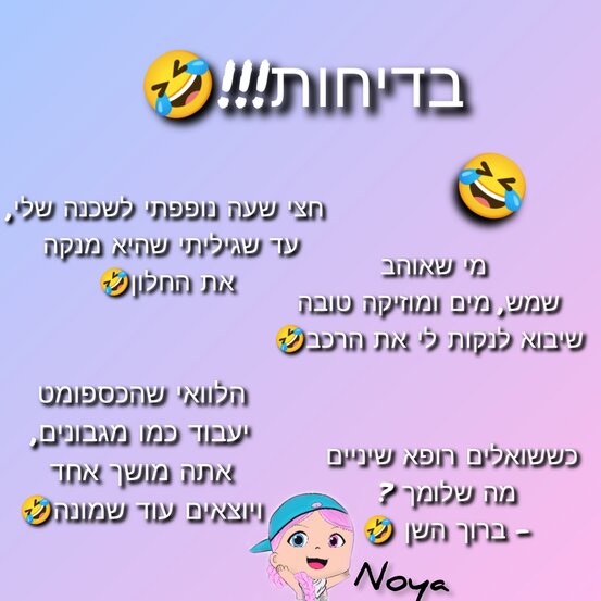 בתקופה הזאת חשוב לי שתצחקו:) אוהבת אתכם ומקווה להעלות חיוך על פניכם:) אוהבת אתכם! |
