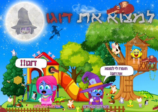 מצאתי את דוגו הדרקון שש פעמים על העץ למעלה, על בית העץ, במגלשה ואפשר לראות קצה שלו בצד שמאל למטה בצד ימין למטה וגם באמצע-ימין למטה אפשר לראות את קצה הכנף שלו! |