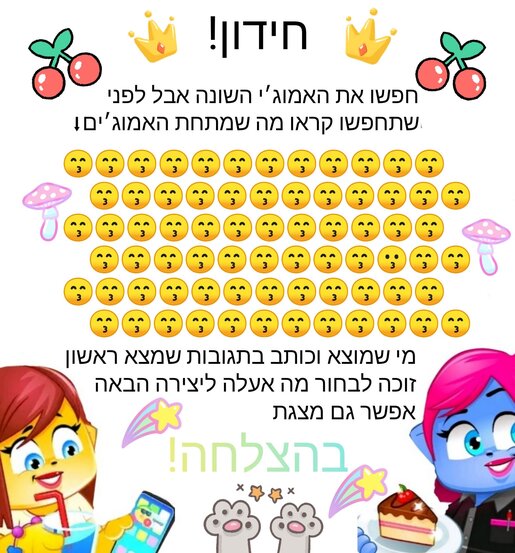 אני מצאתי את האימוגי השונה!! הוא בשורה מספר 4 מלמעלה. ושלוש לצד שמול! |