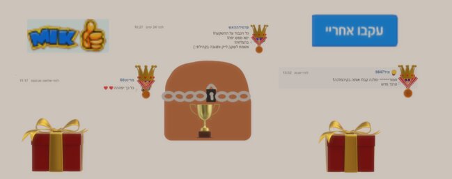 היי בקיות ובקים זאת בקי ואני כאן דבר ראשון כדי לומר ממש סליחה שלא עשיתי יצירות בזמן האחרון אבל אתם יודעים בית ספר דבר שני עשיתי את בלוג הפרס עשיתי מה שכתוב עשתי תיבה יא לא הכי יפה תוותרו לי עשיתי בתיבה כתרים דבר שחשוב לי אתם דבר שלישי אני עושה משהו חדש בהילה כל יצירה אני יגיד שלוש תגובות או שריגשו אותי או שהם יצאו לי שגילגלתי אז מה התחרות? מה עושים? מה מקבלים? מה התחרות הי על תגובות מה עושים תגובה מרגשת מה מקבלים כל תגובה אני נותת לה ליק ועוקב וממלצה עליה זהו חברים מקווה שתהנו מזה וכואב לי הידיים מלכתוב אז ביי