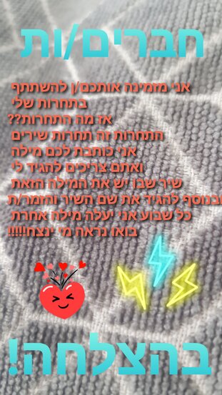 טוב אז החלטתי לעשות תחרות מטורפת והיא משחק שירים איך משחקים ?שאלה טובה !!כל אחד עכשיו שולח לי בפרטי שהוא רוצה להצטרף למשחק ואני ישלח לו את כל הפרטים מקום ותאריך כדי שלא היו מלא אנשים מספר המקומות מוגבל אז אל תפספסו ( המיקמק שלי הוא: מיכלי3353 ולמי שאין מיקטוק שישלח לי פה ואז אני ישלח לו חברות !) מחכה לכם!!!!