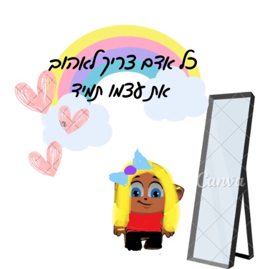 היי כולם היום הכנתי לכם יצירה ממש מיוחדת היצירה היא שכל אחד צריך לאהוב את עצמו תמיד מה זה בדיוק אומר? מישהו שאחרים חושבים שהוא לא יפה בלבוש ואיך שהוא נראה והמישהו הזה יכול שתי דברים 1.להיפגע 2.להתחזק למה להתחזק מה הכוונה? להתחזק זה שאחרי שפגעו בו הוא למשל מסתכל במראה ורואה את עצמו והוא אומר בלב שלו אני אוהב איך שאני נראה ואני לא אתך לאחרים להרוס לי את זה מקווה שאהבתם אם יש לכם שאלה מוזמנים לפנות אלי או בתגובות או במיקטוק