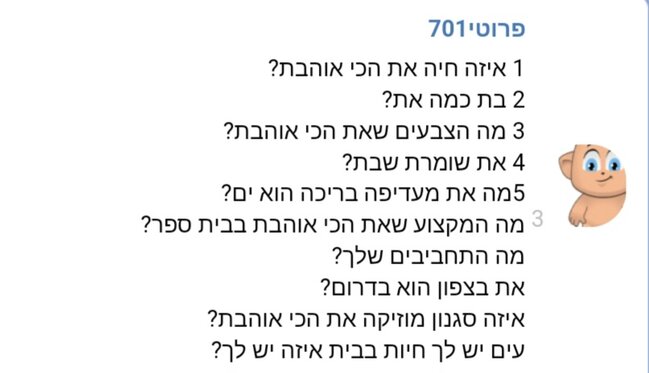 1. תאמת אני פחות אוהבת חיות אבל אני סבבה עם ארנבים או כלבים הם מזה חיות חמודות 2. 13 3. צהוב שחור בנשמה 4. כן חחח צדקת אני 5. בריכה אבל גם כיף בים 6. ספורט 7. אממ אני רוקדת היפ הופ, אוהבת לצאת עם חברות וכמובן התחביב המועדף אני ממש אוהבת לדבר חח 8. מרכז חח 9. ישראלי 10. אמא שלי לא חובבת חיות, כאילו פעם היו לנו המון חיות איזה שרק תחשבי: כלב, חתול, ארנב, אפרוח,ועוד מלא אבל הם לא שרדו חח מסכנים אז יש לנו דגים כי הם שורדים איך שנקרא חח
