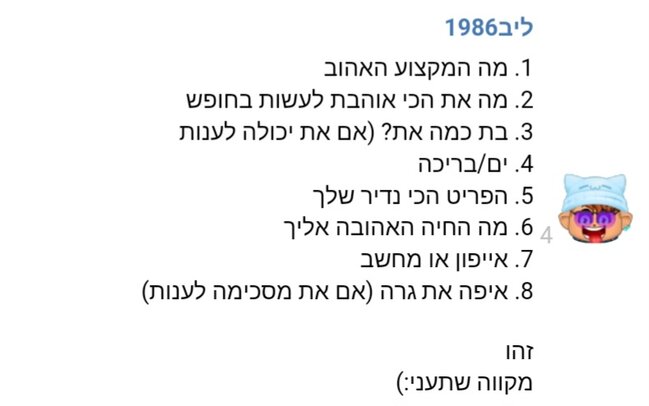 1. ספורט 2. לישון חח 3. 13 4. בריכה אבל גם ים אני אוהבת 5. היה חי כוכב אזמרגד אבל נתתי חינם לחבר אז אממ אין לי כל כך נדירים אני במיקמק כדי לדבר עם חברים פעם היה לי משתמש נדיר מאוד!!! אבל לקחו לי אותו (אם אתם רוצים שאני יפרט עליו עוד אתם יכולים לבקש בתגובות) 6. ארנב וכלב 7. ברור שאייפוןןן 8. אני גרה באזור ירושלים