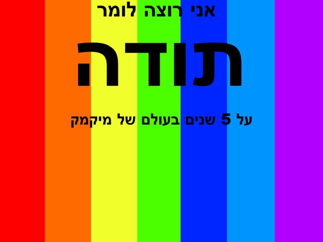 היי לכולם, אחרי הרבה זמן שלא העלתי לפני שני ימים נכנסתי למיקמק 1 ובפוקס שמתי לב שזה בדיוק החגיגת 5 שנים שלי במיקמק!!!!!!! אז אני מעלה באיחור של יומיים :/