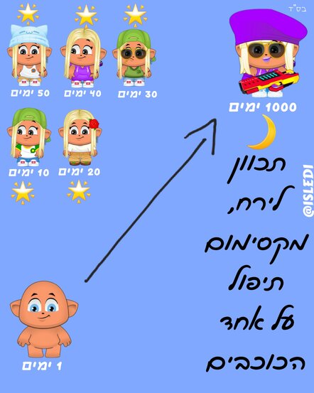 "תכוון לירח, מקסימום תיפול על אחד הכוכבים" הירח שלי זה להגיע לרמת נדירות של 1000 ימים במיקמק 2!!! אבל גם אם עדין לא הגעתי אליו אני יכולה לעצור להפסקה באחד הכוכבים,