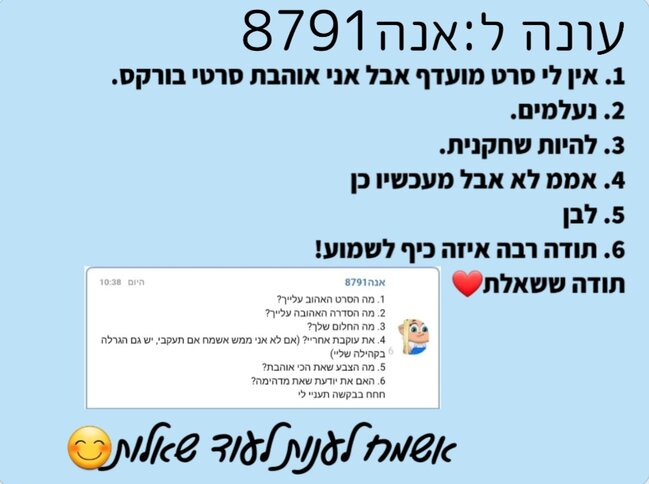 גם אני מאוד אוהבת לבן ואת הסדרה נעלמים וגאם אני מאוד רוצה להיות שחקנית! תודה שענית לי אני אוהבת אותך |