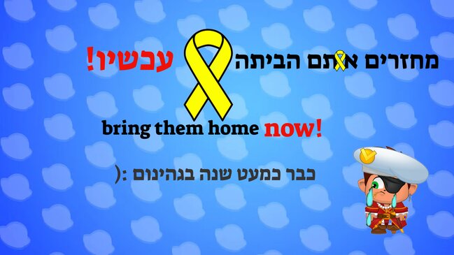 כבר כמעט שנה עברה וחלפה לה מאז השבת השחורה ועדיין יש אנשים נערים ונערות ואפילו ילדים צעירים ותינוק! אבל שום דבר לא קורה בקשר לזה אנחנו מנסים באלפי דרכים לחלץ אותם בשלום זה כזה עצוב לשמוע שכמעט כל הזמן נפש יהודית הולכת לעולמה אז נמשיך להתפלל ולקוות לשובם של כל החטופים הביתה בשלום :( bring them home now! תחזירו אותם הביתה עכשיו! |