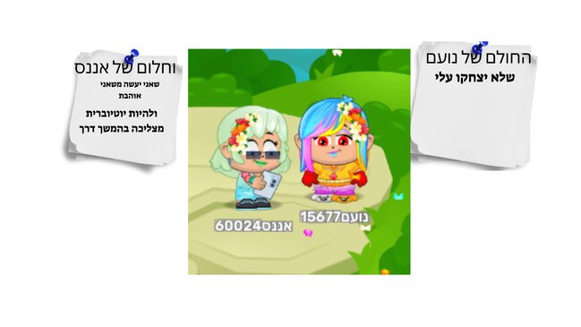 אז עשתי את מיקשימה חדשה אז עשתי זה אם חברה הכי טובה שלי נועם החלום של נועם זה שלא יצחקו עליה ושלי זה שאני יצלחי במה שאני אוהבת ולהיות יוטיוברת במשך דרך ונועם עשתי לוק ציבועני יפה ואני עשיתי לוק של ים רגוע יפה שאחנו נהיה תמיד רוגעים וצבוענים להמשך דרך שלנו ותמיד תגשימו את חלומכם ותעשו מה שאתם רוצים רק שלא תצחקו על אנשים אחרים מקווה ותקשיבו אמור להיות עוד תמונות אבל המנהלים עוד לא יעלו את זה מקווה לזכות