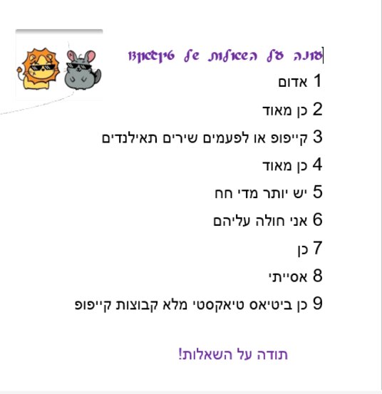 תודה על התגובות אבל אני מקווה שעוד ישאלו שאלות בבקשה