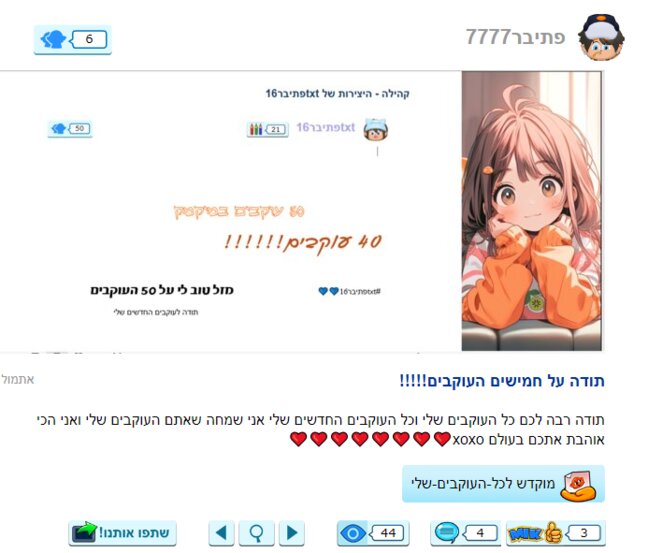 יוסי3245 אני יכולה להביא לך תמונה של המיקמק שלי אבל לשלוח אותה כאן בקהילה? למה שלא תיקח אחת מהיצירות שלי שאתה אוהב במיקמק ותמליץ? כמו שאני עשיתי אבל אם אתה רוצה תמונה של המיקמק שלי אז בסדר אני הביא לך |