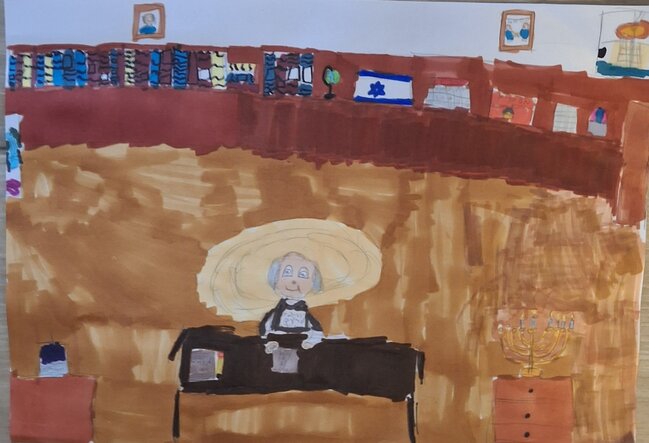 בציור ציירתי את זלמן שזר בלשכתו קורא על היסטורית עם ישראל מאחורי ספרים ותמונות חלנות המשקיפות על הבריכה שטיח יפה גלובוס דגל ישראל מסמכים ותיבה עם מסמכים חשובים ולכן היא נעולה יש גם דלת יציאה והכי חשוב זלמן שזר