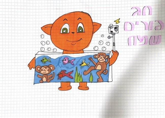 ציירתי מקמק שהתחפש לאקווריום! ובתוך האקווריום יש קופים ודגים! יוצא מהאקווריום בועות! ותוך כדי המקמק מצלם סלפי במצלמה!