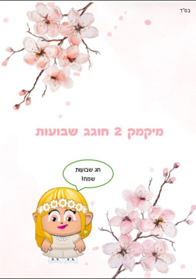 הי מיקמקים מה קורה? מתרגשים שחג שבועות מתקרב? מענין מה מצפה לנו, נכון? איזה מסקרן התמונה שכפירמיק הכין!! יש לכם כבר לוק לשבועות? אז לכבוד החג המתקרב הכנתי לכם.. תמונה לשבועות תכננתי אותה לפני הרבה זמן וגם לערוך אותה לקח לי הרבה זמן! צילמתי את המיקמקית שלי לבושה בלוק שבועותי אומרת: חג שבועות שמח! ופרחים יפים מסביב מה אומרים על התמונה? וצילמתי לכם אותי ואת 3200לולי עושים תמונה, ראיתי שהוא גם שלח אותה אז עוד מאט אשלח גם את מה שאני צילמתי נפגש ביום ראשון, מחכה לראות כבר מה מצפה לנו.. יאללה שבועות מיק שמח לכולם!!