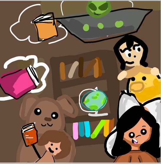 היי כולם עשיתי יצירה למיקשימה אז מה בעצם רואים בתמונה??? כורסאות ביצה ואפרוח הספרנית החמודה למטה (אני) ילדים קוראים ספרים הילדה קוראת אוכל טעים במיקפה יש ספרים ציבעונים ספרים עתיקים וחומים עננים אם ספרים מעל ואפילו חייזר!!! אז וואו שווה לבוא לסיפרייה שכזאת