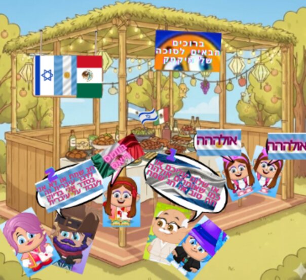 טוב אז היי חברה כפי שראוים בתמונה שלט של ברוכים הבאים לסוכה של מיקמק וגם יש שלט רק שלושת הארצות יפה נכון ויש תבעות דיבור שיש לכול אחד תמדינה שלו בבעות דיבור מגניב נכון ויש גם מהכלים מישלושת המדינות ויש תאומות בצד מושלמות ועוד אחת מימקסיקו שהיתלבה עד שבא לבד וכמובן שבוגרת ויכולה לטוס לבד וחברה יש את ההורים של התאומות מארגנטינה וגם הישראילים המיקמקים שמארחים אז יפה נכון טוב אז חברה בהצלחה לכולם במקשימה וזה הזמן להפוך תמילים לחברים וליאות חלק מהקהילה שליייי טוב אז ילא בייייי נ.ב עוקב תגובה לייק וילא ביייי