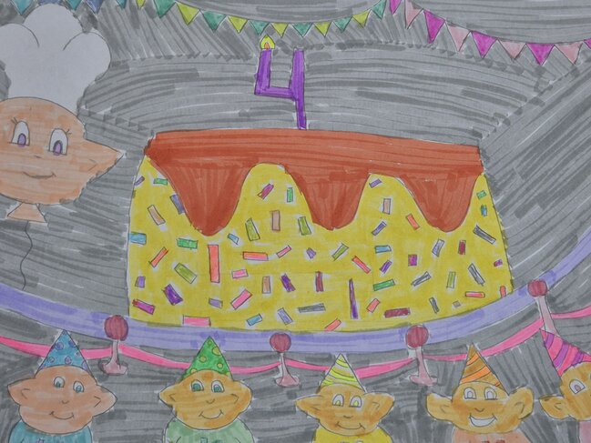 ציירתי את הבמה במיקפה ויש עוגת יום הולדת ענקית לכבוד מיקמק.
