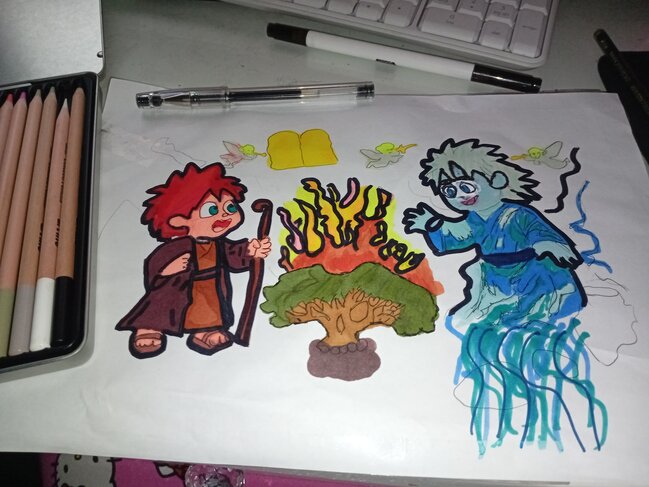 היצירה שיצרתי במיקמק מבטאת חיבור עמוק בין מסורת, יצירתיות ודמיון אישי. שמי הודיה, ובשם המשתמש שלי "נערמיק" ביקשתי להביא לידי ביטוי סצנה משמעותית מתוך ההגדה של פסח – הסנה הבוער. בחרתי להתמקד ברגע טעון ומשמעותי זה, אשר מסמל התגלות, שליחות ואמונה. ביצירה שילבתי את דמויותיהם של המנהלים יונמיק, משה ואסי אלוהים, אשר צוירו בקפידה ובהתאמה לרוח הסיפור. הבחירה בהם לא הייתה מקרית, אלא מתוך רצון להעניק פרשנות ייחודית ומקורית לסיפור המסורתי.
