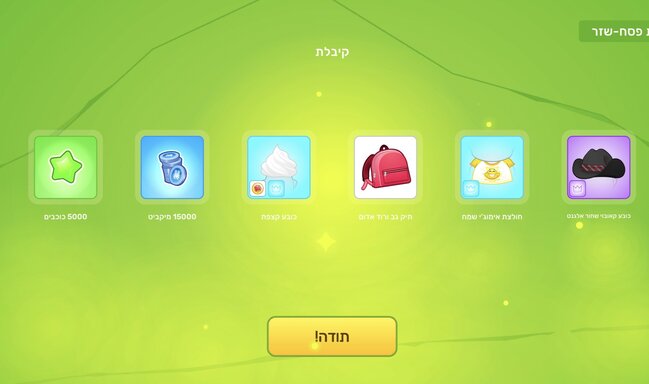 אוקיייייייי אז היי!! ממש לפני כמה דקות סיימתי את המשימה האחרונה של זלמן לפסח! (אממ בכל המשימות נעזרתי בסרטונים ביוטיוב,אז תודה לכל מי שעשה סרטונים ועזרר!!) אזזזזז,אני רציתי לסכםםם:) טובבב דבר ראשון: המישמות היו,וואו! ככ מושקעות,מגניבות,ומעניינותת והקטלוגים?! אימלההההה חייבת לצייןןןן,,שהיו לי פריטים מלפני כמה שנים כברר שהיו עכשיו בקטלוגיםםםם כמו חלק מהגלימות.. והכפכפים התנכיותתת שזה היה ממש מגניב לוללל! ,, וגם מהזה הפרסים השווים האלווו?? תגידו לייייי מהזההה בסוףףף,כשחוזרים לזלמן אחרי שסיימנו הההכככללל מקבלים 15,000 מיקביט,זה מלאאא נראלי להרוב היה יותר מזה כבר,אבל אמ לי לא,לול אבל חיחיחי כןןןןן:))) היה לי ממש כיףף להיכנס כל פעםםם אז תודה רבה רבה רבה צוות מיקמק על הכלל! אתם הכי משקיעים בארץץץ❤️ אוהבתת. נשיקותת(קיטי,רק איכותיים יבינוווו>>>) דושיר1112 שנזכה לבשורות טובות יותר.