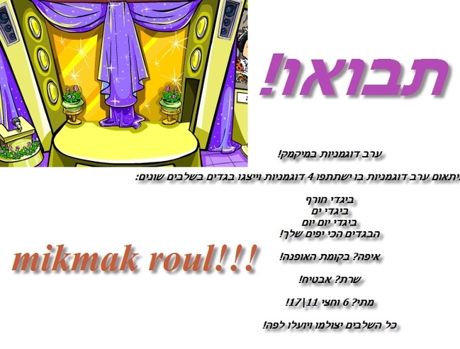 הייתי שמחה לבוא אבל לא יכולתי.הרעיון על הדוגמניות מוצא חן בעיניי לדעתי זה רעיון גאוני |