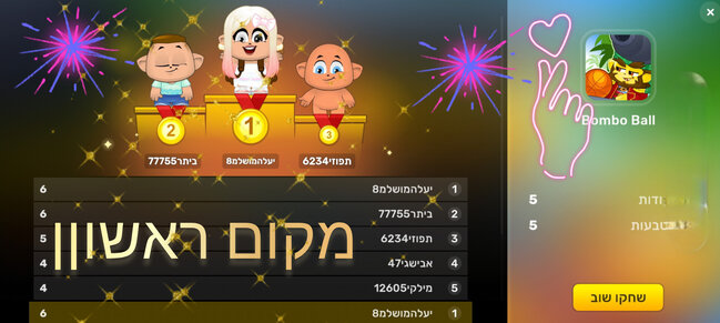 היוש כולם מה קורההה יואו כמה זמן לא כתבתי לכםםם יאאאא סוף סוףף כל הזמן האיתי עסוקה בלימודיםם אבל עכשיו יש לי סוף סוף קצת זמן פנוי (כשאני לא מרגישה טוב) וסתם שיעמם לי אז יצאתי קצת למיקמק הלכתי לברכה ויואווו נוסתלגיההה המישחק של הכדור סללל שיואוו כמה זמן שלא שיחקתי בואא ישר אמרתי לעצמי יעל את לא עוזבת אותו עד שאת לא במקום הראשון (לא שזה כזה קשה) והינה אני יעלהמושלמ8 עומדת לה על פיסגת הניצחון של המקום הראשוןן קולולו (הגזמתי) קיצר תגידו לי מה השיא שלכם ואשמח שתעקבו אני כבר רוצה לעשות חלוקת מתנות ממש בקרוב ביושששש