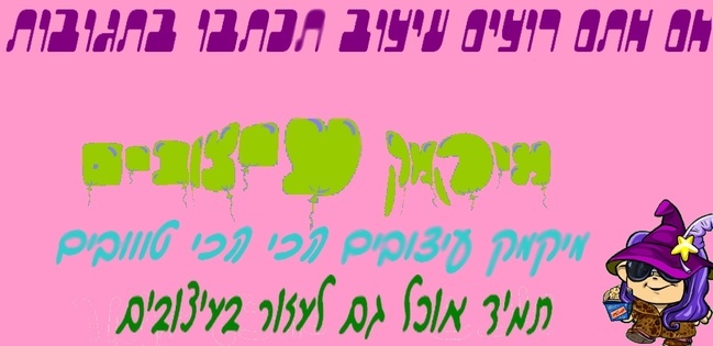 ותיכתבי גם הקדשה שיהיה כתוב בה:לכל אתר המיקמקים אתם נחמדים ומתוקים שלחו לתותי409 לפחות תגובה אחת כדי שהיא תישמח ובתודה מיקמק94 הנשמה של כללל המיקמקים.=] |