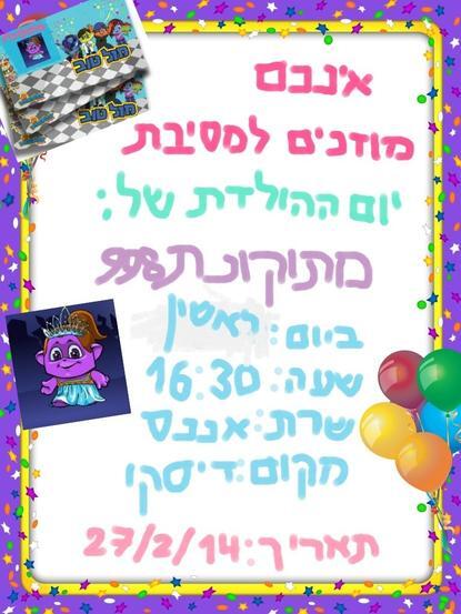 מזל טוב אני אבוא מבטיחה יפה ואחלה רעיון אני מכירה אותך זוכרת הינו חברות ואני שוב אפגוש אותך איזה כיף מזל טוב |