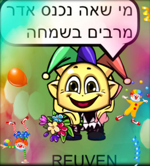 היי כולם בעוד שלושה ימים לפי הלוח העיברי יהיה ראש חודש אדר א' ונוהגים לומר מי שנכנס אדר מרבים בשמחה אז תרבו בשמחה לא רק החודש הזה אלה כל החיים שלכם :) נכון שמתחילים את פורים רק באדר ב' אבל אל תדאגו גם בחודש הבא תהיה יצירה מיוחדת לפורים :) אז יש למה לחכות אני רק מזכירה לכם שאני עוד מעט יעלה את הקומיקס החדש "זהירות ברשת" אז בייוש :) נ.ב כל הזכוית שמורת ל §♫REUVEN§♫ הפקות תודה ♥