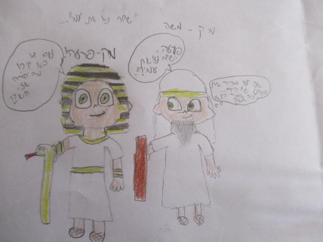 שהיה חופש פסח, הייתי במשרד של אמא שלי .. אז ציירתי את משה ואת פרעה, מדברים על "שלח נא את עמי..." ופרעה מדבר יותר בשפה של היום חח..