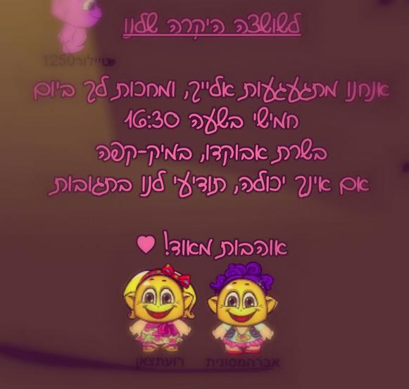אני ממש מקווה שתעלו את זה, אנחנו לא מוצאות את שושצה וחשבנו שאם נעלה לקהילה ונקדיש לה היא תקבל התראה במיקמק.