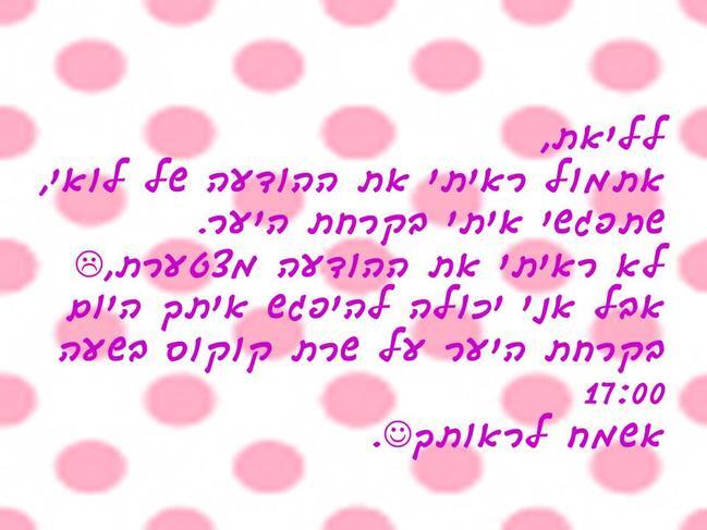 אשמח אם תגידי ליאת מתי תבואי לבקר :) |