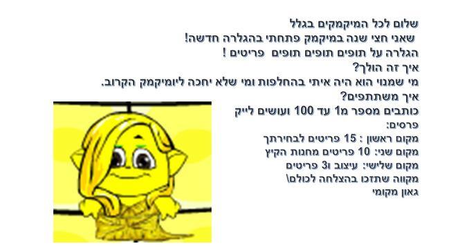אשמח להשתתף, אני אחכה ליומיקמק (אלא אם אזכה במנוי בגלגל כלשהו) מספר 11 |