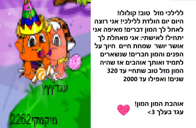 היושים! לילכי אני רוצה לאחל לך המון המון המון המון המון המון המון המון המון המון המון דברים 3> אז אני יתחיל... אני רוצה לאחל לך שהיה לך באושר ובמזל תמיד אני היה לצידך בכל מצב\משבר\תקלה\ריב עם מישהו בכל מצב אישתי אני ממש אוהבת אותך אז שהיה במזל ובטוב שנשאר חברות לנצחחח נצחיםםם שנהיה ביחד לעולמי עולמים ולא יוצא לי חרוזים טובים שלא נאבד אחת את השניה ושתמיד נסלח על טעויות ועל בלבול או טענה אני מאחלת לך את כל הטוב שאפשר שתמיד נצחק\נחייך\נספר בדיחות\נזכר בזכרונות\נאסוף עוד חוויות לילכי מקווה שאהבת את היצירה המיוחדת בשבילך וסליחה עם זה יעלה באיחור קצת אוהבת המון המון המון המון המון המון המון המון המון המון המון המון המון המון המון המון המון המון המון המון המון המון המון המון המון המון המון המון המון המון עגדץץץ אולי לא כתבתי מספיק המון נראה לי שהבנת 3> מזל טוב!