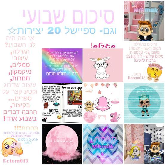 היי חברים, אז היום אני הכנתי יצירה שמדברת על הסיכום השבועי בקהילה שלי! וגם- שברנו שיא עולם! 11 יצירות בשבוע! בנוסף, זאת היצירה ה-20 שלי♡ אז מה היה לנו השבוע? -עיצובי לוגואים לתצמה1, -עיצוב לוגו לטלמונית, -הגרלה, -תחרות, -הכרזה על הזוכים בהגרלה, -עיצוב לוגו לתותיסיוון, -קטע על ספרים, -עיצוב לשדרוג החודש- Mikpink, - המיקמקון-מה חדש? בקיצור הרבה דברים... זאת היצירה ה-20 שלי אז עכשיו מתחיל "ספיישל 20 יצירות!" מקווה לזכות בתמונת היום! אוהבת♡ |