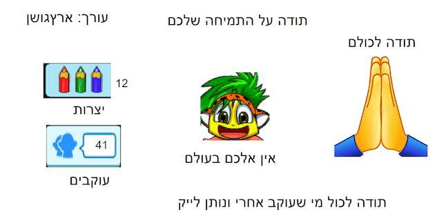 התכלתי את הקהילה שלי לפני חודשים והתם נתתם לי הרבה תמיחה אני מודה על הכול תודה על 41 רשומים מימני: ארץגושן