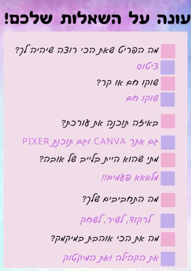 1 מקס 2 שניהם 3 אני לא יוטיובר 4 לא הייתי בהמון לייבים חוץ מאובה 5 ספורט לשיר לרקוד והמון 6 המון דברים מקווה שתראי את התגובה שלי |