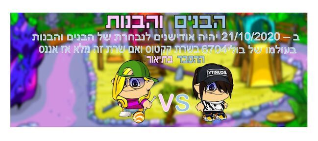 כמו בכל הבנים והבנות יהיו מנחים אני ובולי6704 נמלא את התפקיד הזה. הבנים והבנות יצולמו ליוטיוב!! לערוץ של בולי!!