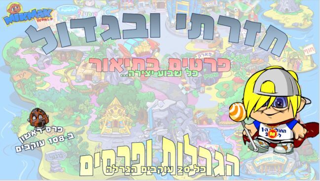 ח-ז-ר-ת-י היייייייי מה נשמע אז מה קורה?... לפני כמה זמן חשבתי אולי בכול זאת יחזור למיקמק לשנה וווווחזרתי!!! אז מה יהיה: הגרלות, פרסים, עיצובים, ועוד ועוד... נתחיל בפרסים: פרסים יהיו לכל מי שיביא לקהילה 5 עוקבים. הגרלות: הגרלות יהיו כל 20 עוקבים על נדירים. עיצובים: כל שבוע אני יעשה עיצוב למיקמק שאני יבחר. (מי שרוצה שיכתוב לי בתגובות). תגידו לכל החברים שלכם על הקהילה ותקבלו פרסים