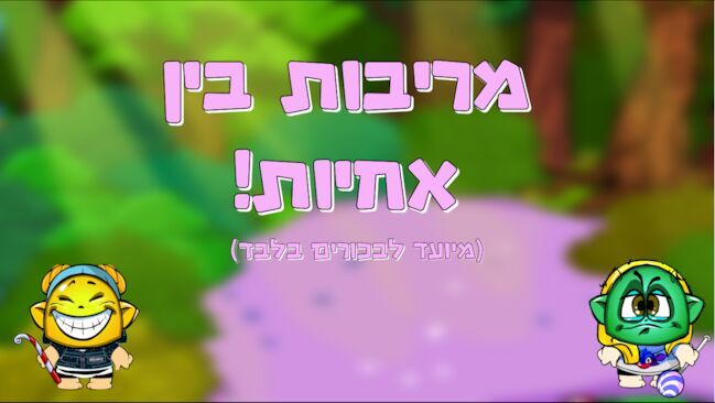 אומייגד בחייםםם לא הוציאו לי את המילים מהפה בצורה ככ מושלמתתתת גם לי יש הפרש עם אחותי של 5 שנים!!! (היא כיתה ג ואני ח) וההה אמאלה מלחמההה אחת עם השניההה וכמובןן ההורים איתהה ואווווווו סיטואציה- גפןןןן המדגיש שלי!!!!!! לאאא הוא שלי!! לא הוא לא שלך!!! הוא כן!!! שקרנית אחת!!! את שקרנית!! גפן את בכלל לא צריכה מדגישים מה יש לך?!?!?!?!! אני כן צריכה אני עושה יצירה!!! *אמא שלי* הדרי תני לה אבל אמאא!!! זה שלי!!! המדגיש עובר אליה והיא מוציאה לשון-_- |