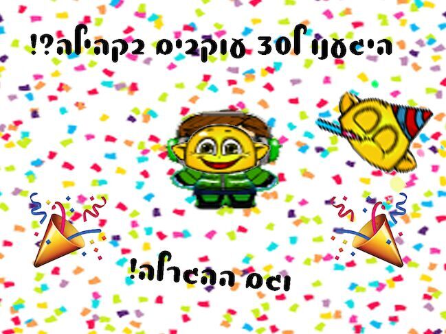יוווווווווווו אני לא מאמין אנחנו הגענו ל30 עוקבים בקהילה!!!!!!!!!!!!!!!!!!!!!!!!!! טוב לכבוד זה אני עושה הגרלה (שתוצד ביצירה הבאה) וההגרלה הבאה תהיה ב60 עוקבים(אני מאמין בכם!) ואז אתם שואלים "איך נגיע ל60 זה הרבה!" אז אני יענה לכם ככה "תשתפו חברים בכיתה, חברים במיקמק, אנשים שאתם מכירים טופ?" טוב ביוש