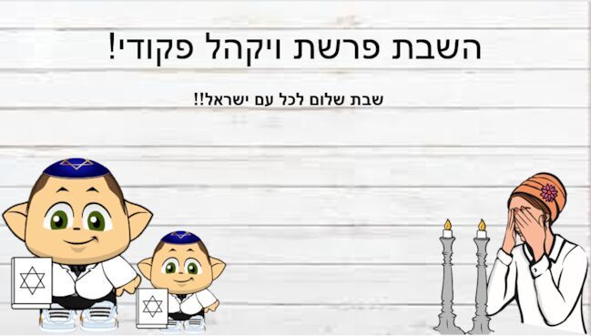 אז לחידה של השבוע: כמה חומשים יש? יאללה רוצו ותכתבו מהרר!! --------------------------------------------------------------- השבת, שבת פרשת ויקהל פקודי!! (כמובן כל אחד יודע:)) יאללה חברים אני צריך לעזור לאמי ולאבי לעזור בהכנות לכבוד שבס קודייש!! אוהב.. איוששש1