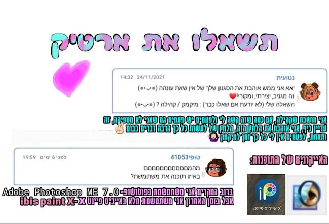 היוש ארטיקים! מה ניש? אז הדבר הראשון מהרשימה שלי לתחילת 2022 זה- תשאלו את ארטיק! =) ראיתי את שתי השאלות האלה ורציתי לענות פה ולא כל פעם ספציפית להודעה, אלא בגדול, ועם הקדשה, וכי ראיתי שאוהבים את הפינה הזו❤ אז אז אז, כן, אלא השאלות, תשלחו לי כמה שאלות שאתם רוצים, אני כל הזמן יענה גם אם זה לוקח קצת זמן לא לברוח, מה שאני מבטיחה לכם אני מאוד משתדלת לקיים❤ וגם את היצירה הזו אני מקדישה לכל מי שהגיב בקודמת❤ אגב, לאחרונה גיליתי שמורנוש הגיבה לי הרבה פעמים, גם לזה אני חייבתתת ספיישל :O, אני מעריצה את מורנוש❤