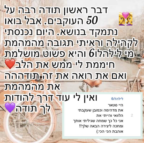 אני ה53 יש לך קהילה מהממתתת הגעתי מהמלצה על הקהילה שלך:) אשמח להקדשה! וגם לדעת איך את עורכת כי את עורכת כמו הטיקטוקריות האלו שיש להן איזה 2K עוקבים ביוטיוב (בקטע טוב, ואולי תפתחי ערוץ מי יודע...) אוהבת אותך מלאאא |